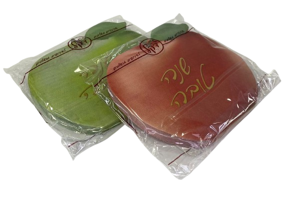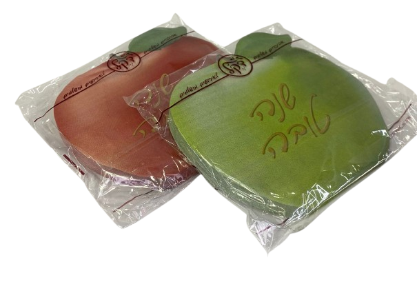מפיות נייר בצורת תפוח עם כיתוב "שנה טובה", בצבעים ירוק ואדום, מושלמות לאירוח חגיגי בראש השנה