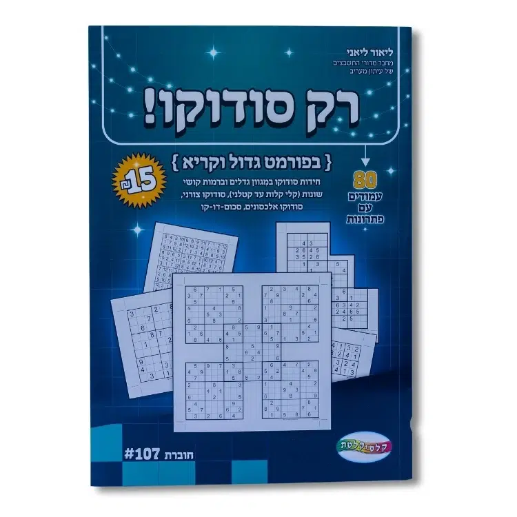 היכונו לאתגר סודוקו ממכר בחוברת פורמט גדול וקריא! כאן תמצאו 80 עמודים עם חידות סודוקו בדרגות קושי משתנות – החל מקל ועד קשה – כולל סודוקו קוני, סודוקו אלפביתי, סודוקו סבב-רודקו, ועוד חידות שישפרו את כישורי החשיבה שלכם.