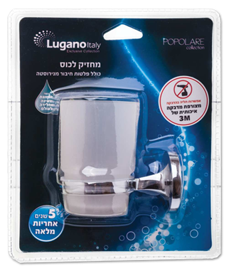 מחזיק לכוס למברשות שיניים מבית Lugano Italy, מסדרת Popolare. עיצוב מודרני ונקי עם פלטות חיבור מנירוסטה המבטיחות יציבות ועמידות לאורך זמן. התקנה קלה ופשוטה בעזרת מדבקה מיוחדת של 3M, ללא צורך בקידוח, לקבלת מראה אסתטי ונקי בחדר האמבטיה.