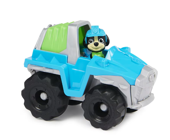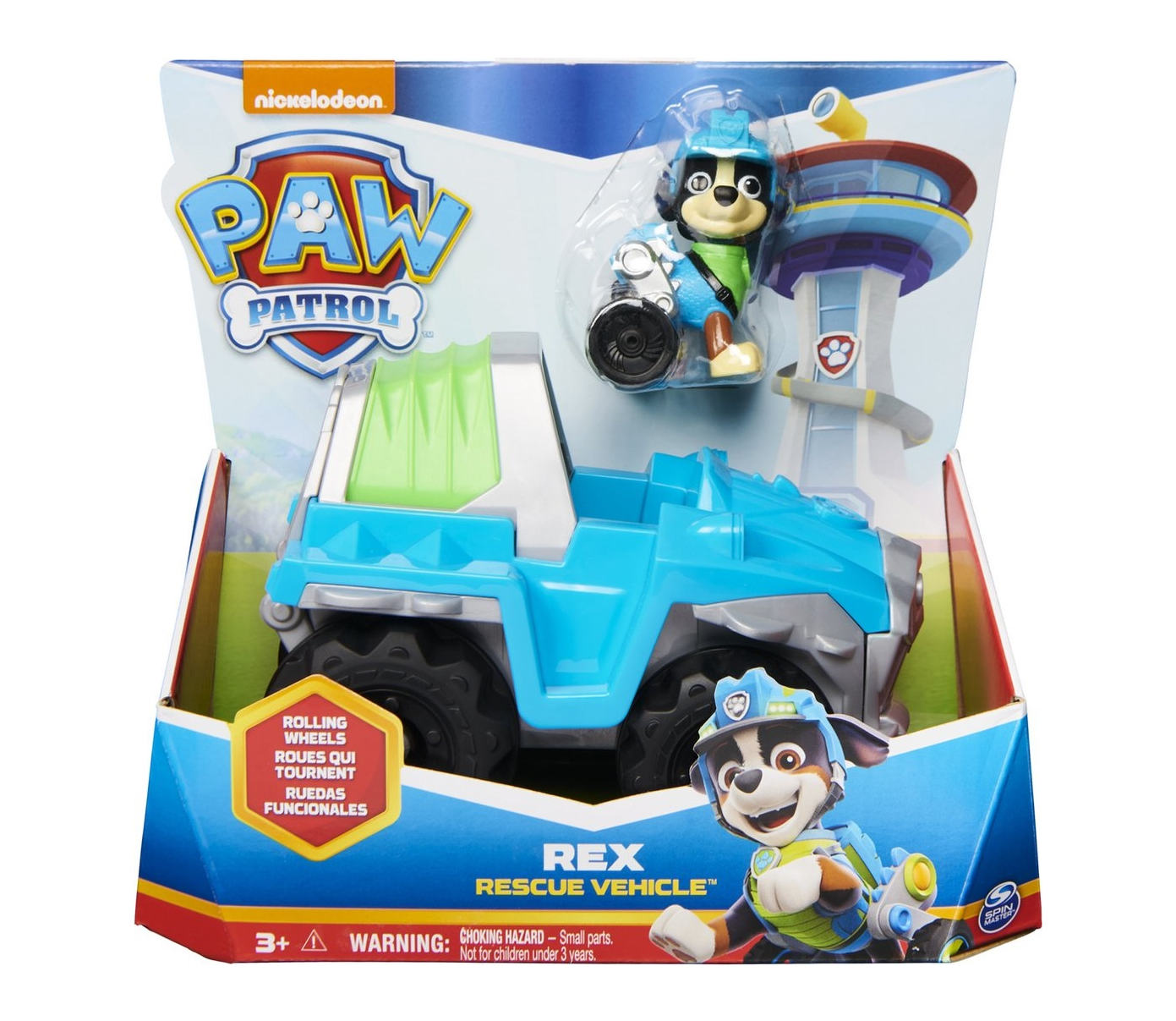 דמות רקס, כלב ההצלה מסדרת הדינוזאורים של Paw Patrol, עם רכב חילוץ מאובזר למשימות הצלה מרתקות.