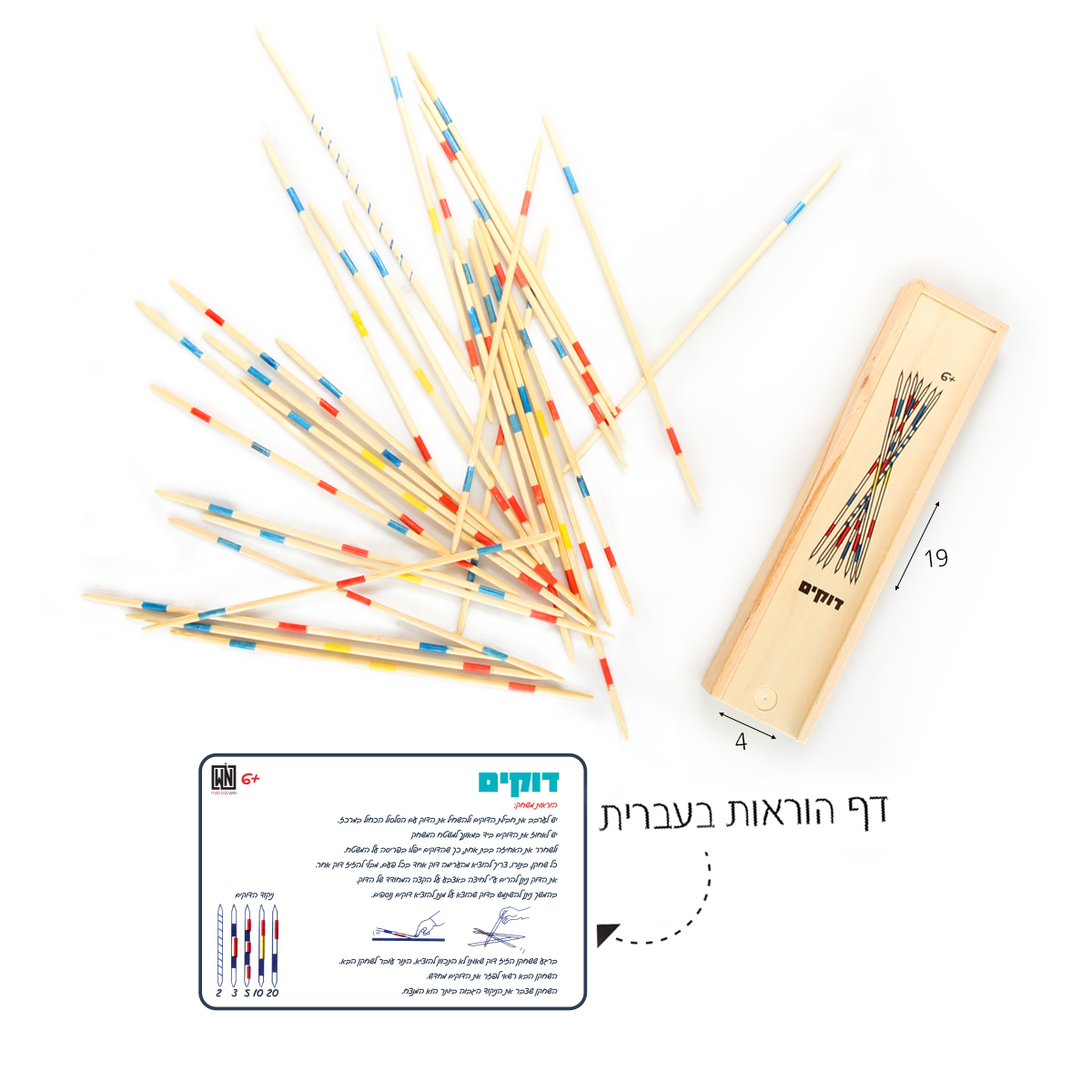 משחק דוקים קלאסי מעץ, כולל 41 מקלות צבעוניים ודף הוראות בעברית, לאימון הסבלנות והדיוק.
